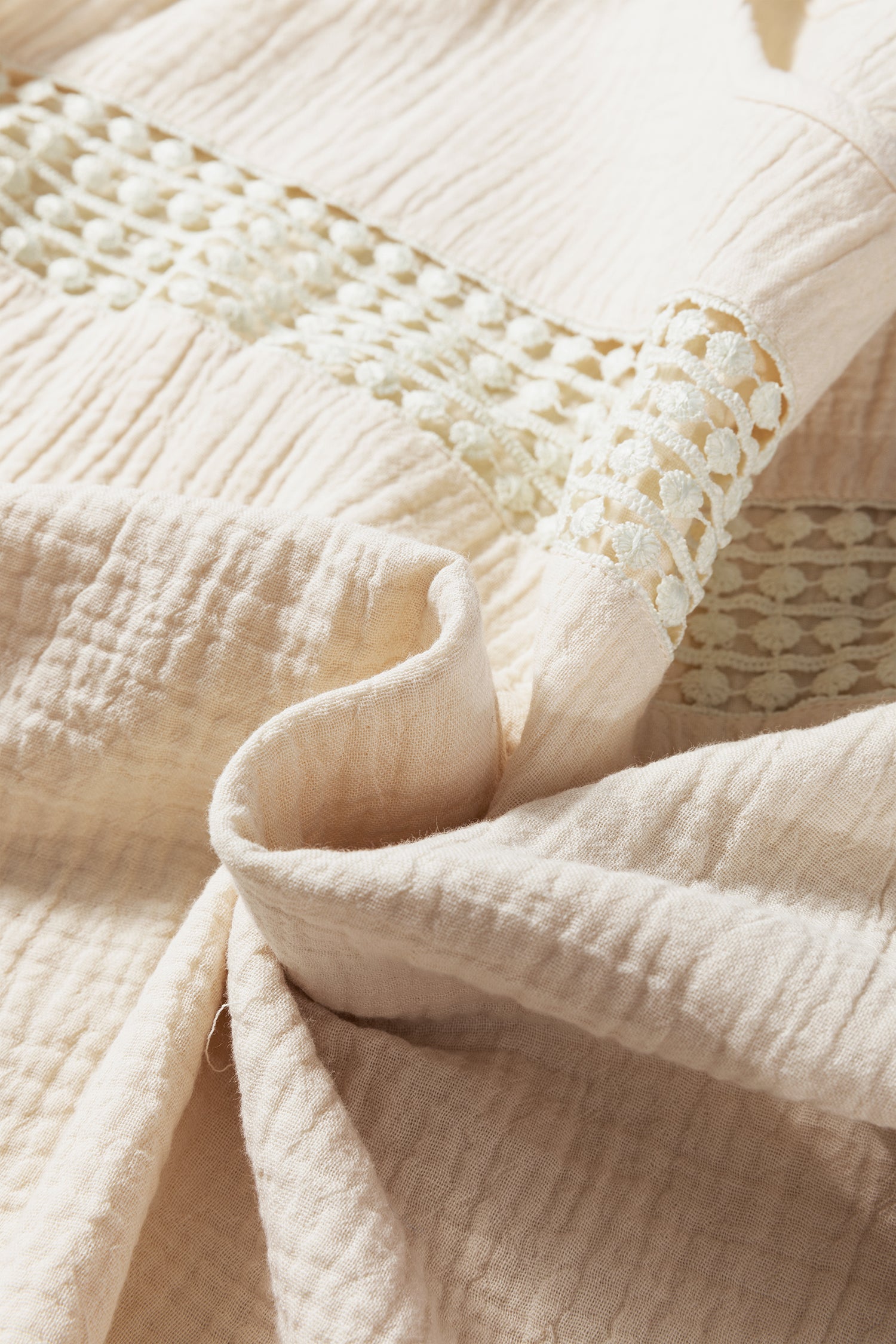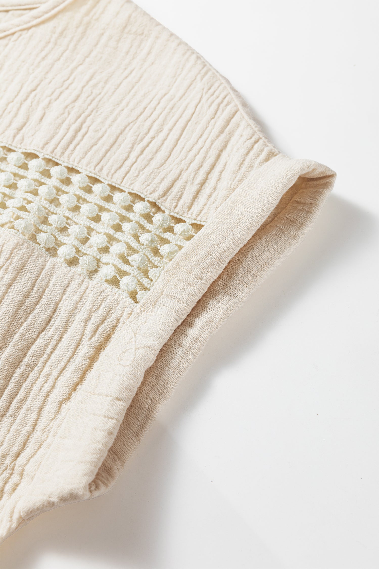 Beige Crochet Insert Textured Cotton Short Sleeve Blouse Top