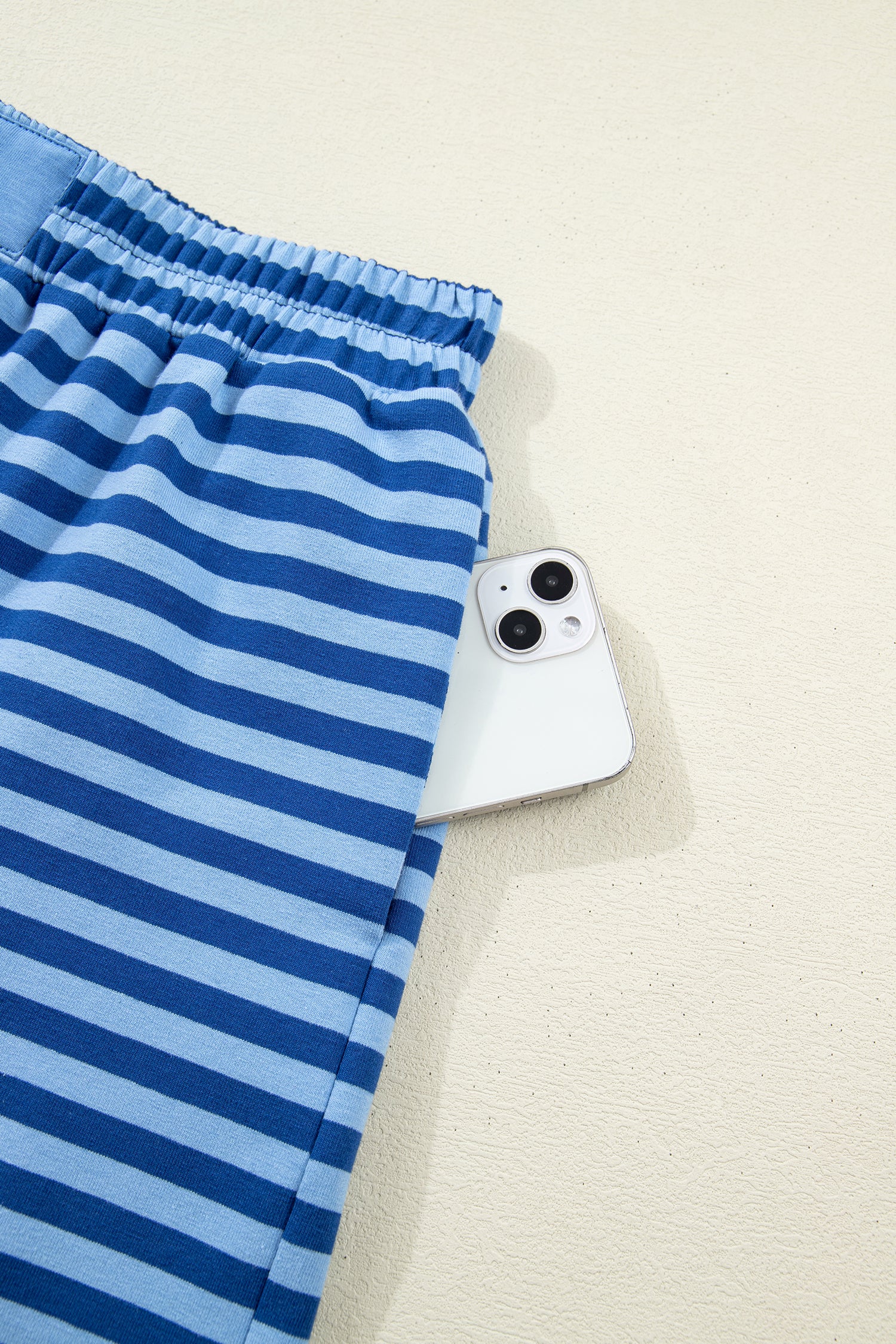 Blue Stripe Drop Shoulder Long Sleeve Pullover Elastic Waist Casual Short Set
