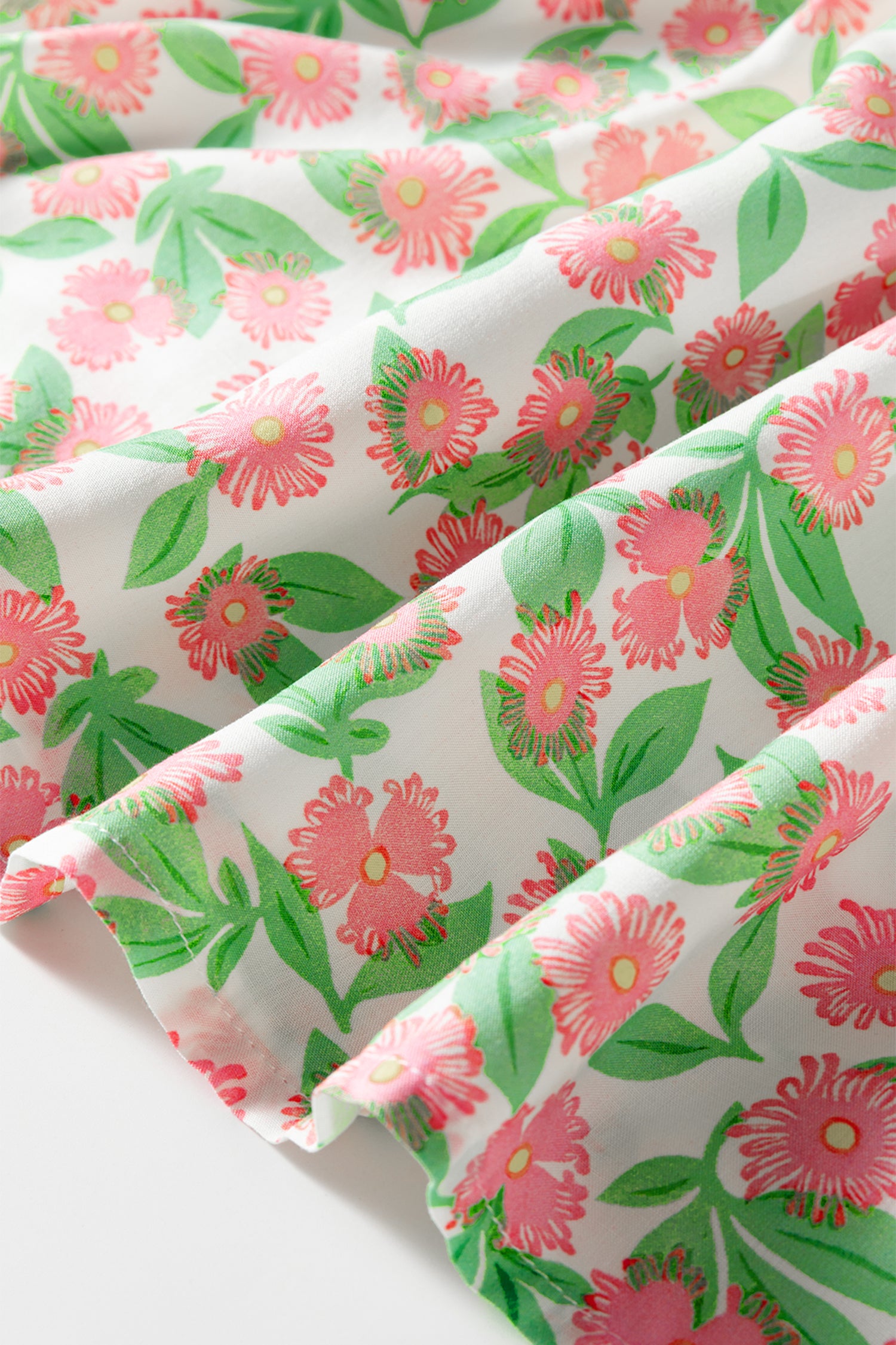 Featuring a cheerful floral print, color block patchwork, and sweet contrast trim.
