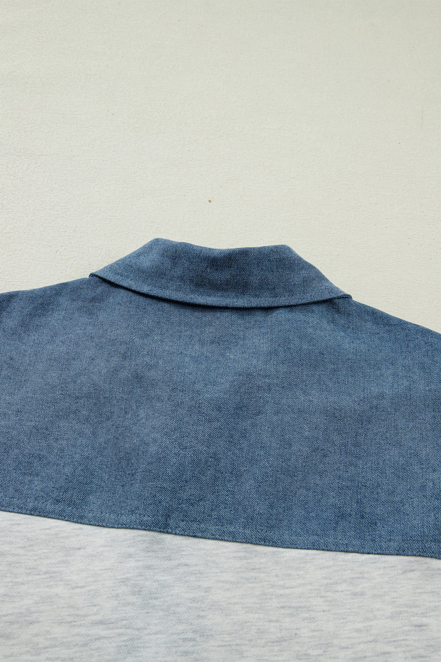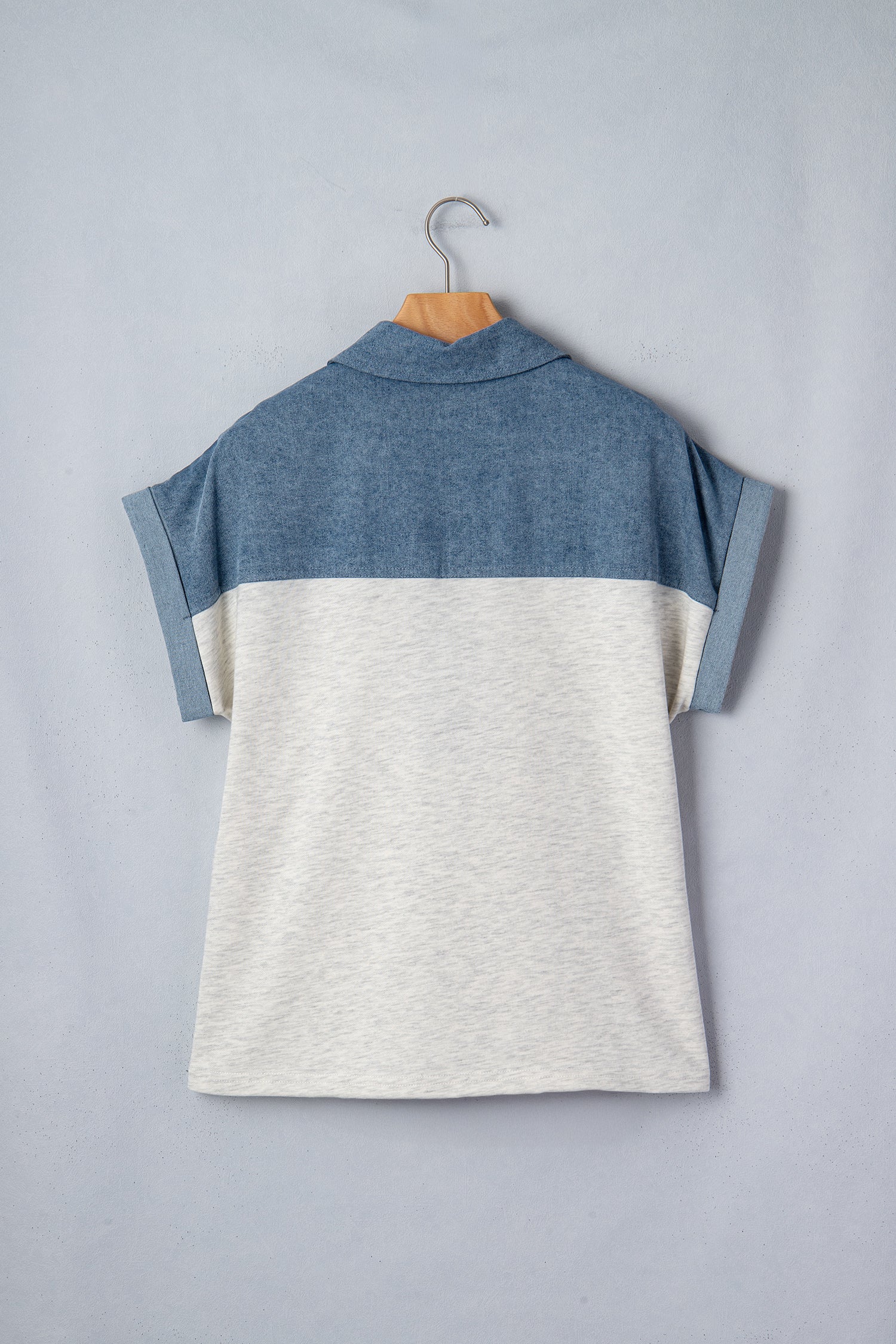 Light Grey Color Block Denim Patchwork Button Polo Collar Short Sleeve Top