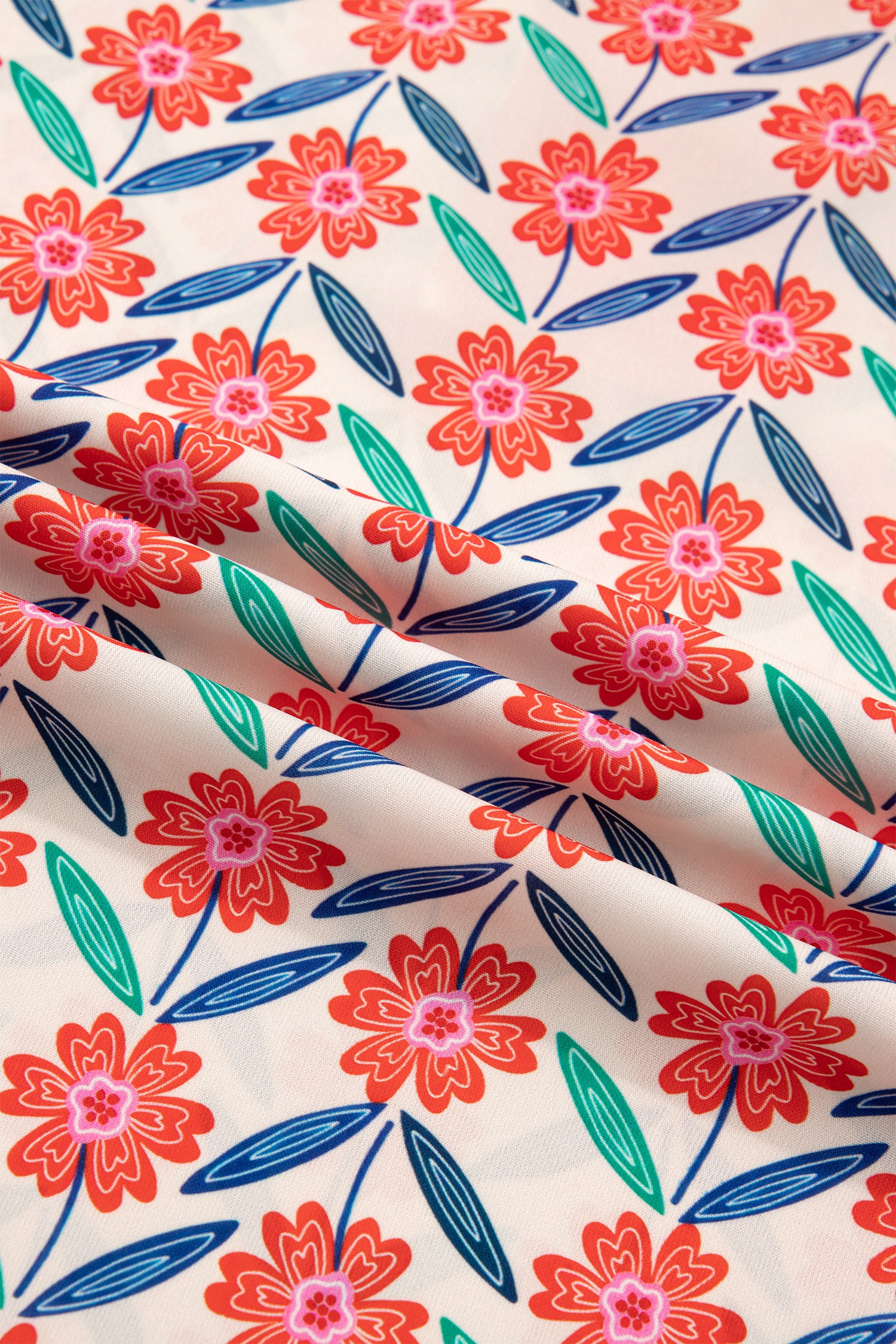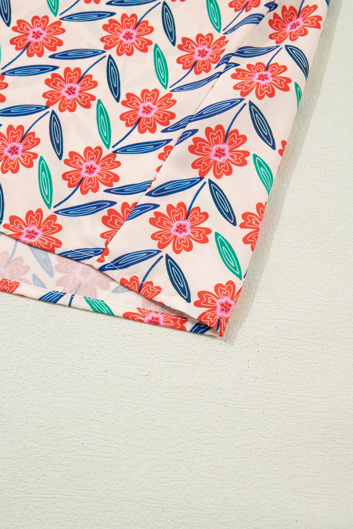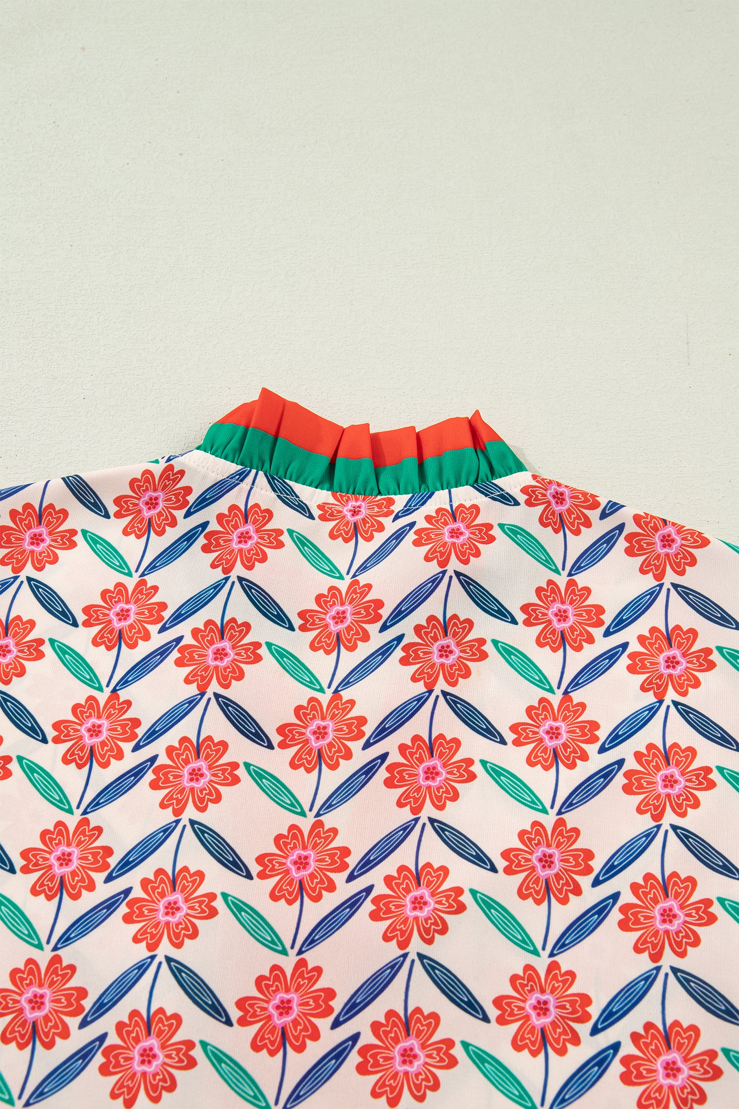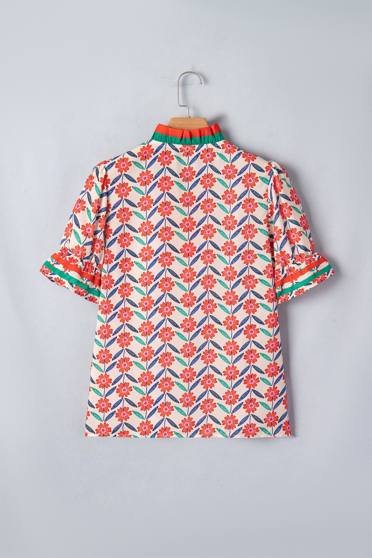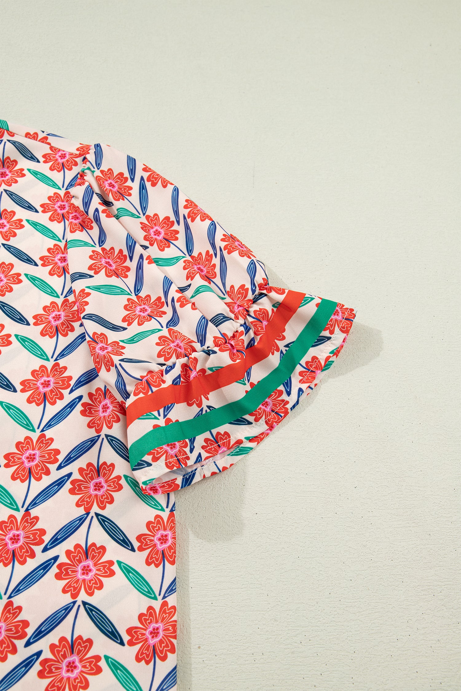Red Floral Print Striped Detail V Neck Ruffled Short Sleeve Blouse